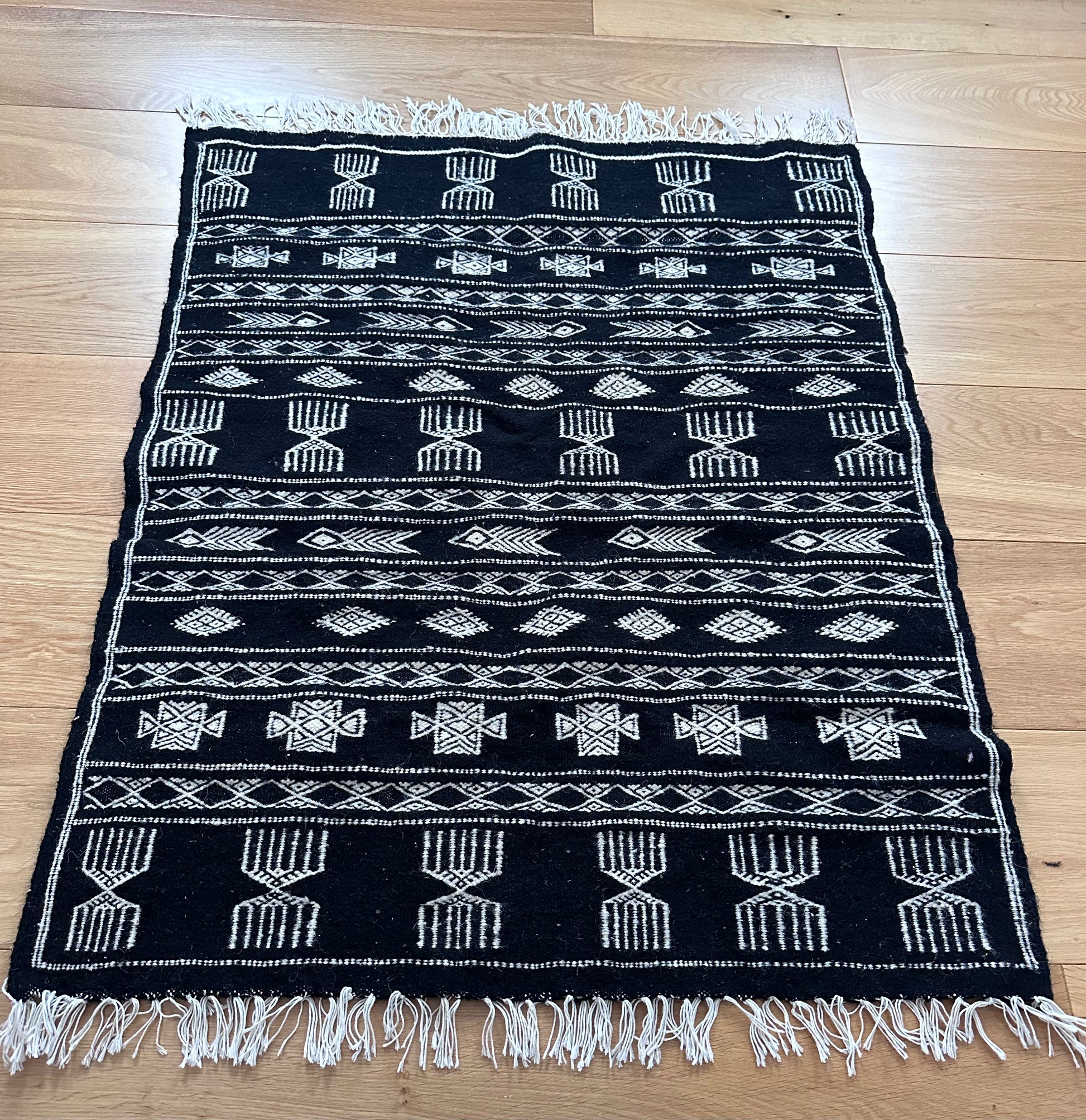 Tunisian wool rug from the south of the country near Tataouine. These rugs are hand-made by women in the region who sell their rugs to supplement their household income. Each rug is unique, although the use of symbols is common, and many of the same symbols are used in particular regions to denote their origin. Regional, tribal and familial symbols are woven into these rugs, and the practice is passed down generationally from mother to daughter. The beauty of these carpets is that no one carpet is the same. There are 'imperfections' in the weaving which are proof that they are hand-made, rather than mass-produced.